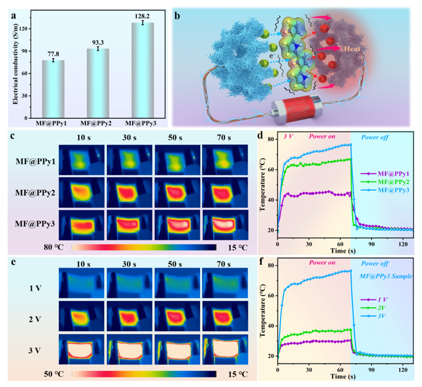 图5 MF@PPy泡沫的电热转换性能。a MF@PPy泡沫的电导率。b MF@PPy泡沫的电热转换机理示意图。c MF@PPy泡沫在3V电压下的红外热图像和 d 温度-时间曲线。e MF@PPy3在不同电压下的红外热图像和 f 温度-时间曲线。
