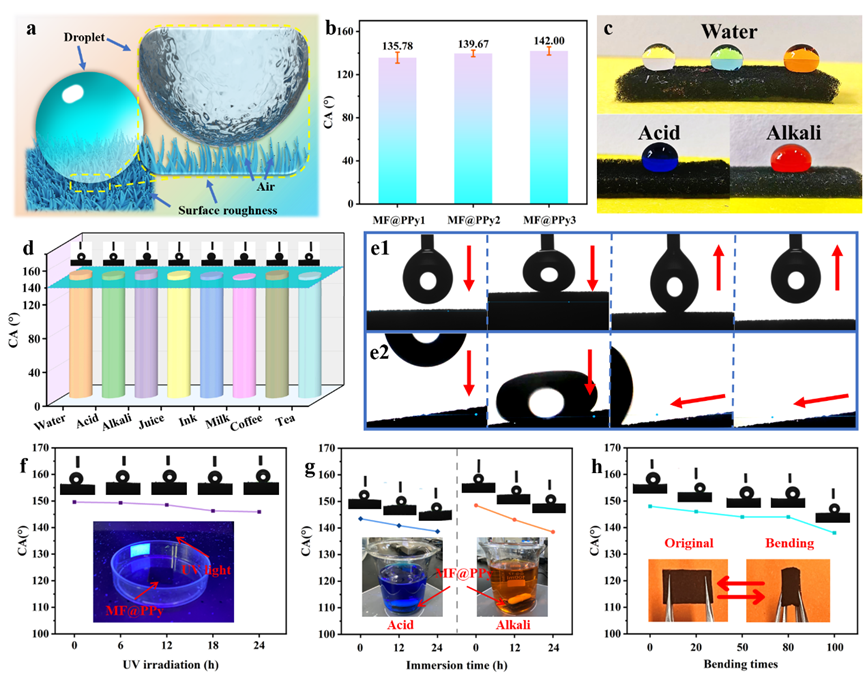图3 MF@PPy泡沫的疏水性能评估。a MF@PPy的疏水机理示意图;b MF@PPy1、MF@PPy2和MF@PPy3的水接触角。c各种液滴在MF@PPy表面的照片。d各种液滴在MF@PPy表面的水接触角。e1, e2水滴在MF@PPy表面接触和滚动示意图。f-h MF@PPy经过紫外线照射、化学腐蚀和多次弯曲后的水接触角。