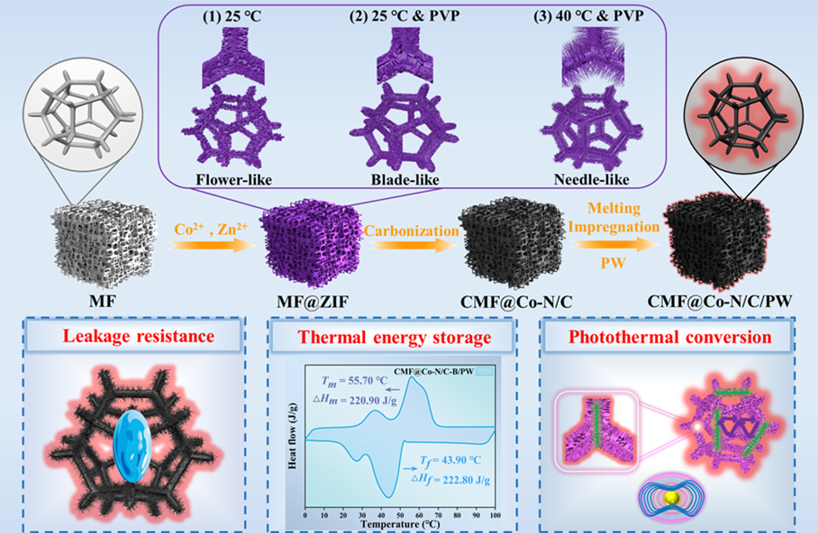 本文开发了一种基于碳化三聚氰胺泡沫(Carbonized melamine foam, CMF)的双金属沸石咪唑盐框架(Zeolitic imidazolate framework, ZIF)衍生的分层网络结构,研究了碳化ZIF形貌对相变复合材料封装和光热转换性能的影响。采用原位生长的方法,通过调控聚乙烯吡咯烷酮和液相反应温度,将具有不同形貌的结构组装到MF骨架上。随后通过高温碳化工艺,生成由ZIF衍生碳层与CMF三维碳骨架相结合的分层碳网络(CMF@Co-N/C)。封装相变材料(Paraffin wax, PW)后,相变复合材料实现了封装性能、导热性能和光热转换性能的同步提升。CMF@Co-N/C利用强大的毛细力和π-π相互作用有效防止液相泄露,确保95.71%的高尺寸维持率和220.90 J/g的相变焓。此外,CMF@Co-N/C的三维连续结构演变为宏观导热途径,并且金属Co纳米颗粒和氮元素掺杂进碳骨架中,有效改善了低热导性缺陷,相变复合材料的热导率提升了100%。通过强化多次光散射和捕获、氮掺杂缺陷碳和Co纳米粒子LSPR效应的协同作用,相变复合材料的光热转换效率高达93.65%。本工作将为先进太阳能相变储热技术的开发提供有益借鉴。