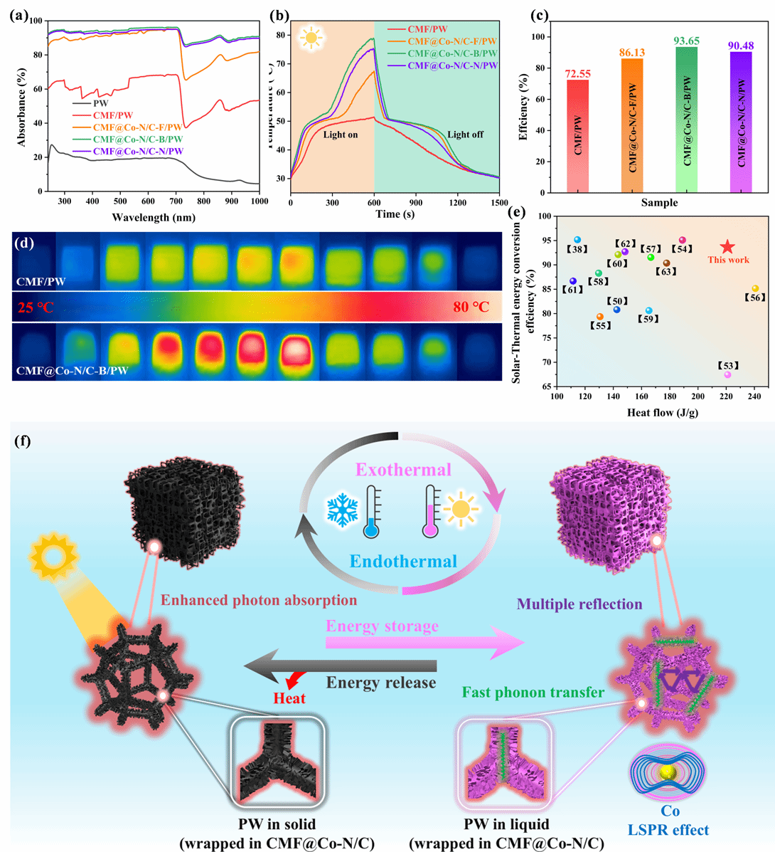 图5. (a) 样品的光吸收光谱分析;(b) 有光照和无光照条件下样品表面温度波动曲线;(c) 样品的光热转换效率值;(d) CMF/PW和CMF@Co-N/C/PW的红外热成像图;(e)参照以往研究的热焓值与光热转换效率比较图;(f) CMF@Co-N/C/PW光热转换和热能储存机理示意图。