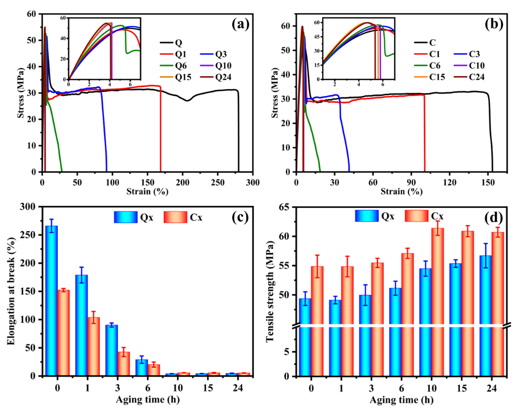 图1. (a)淬火和(b)冷压试样在不同老化时间下的应力-应变曲线;(c、d)两种样品的断裂伸长率和拉伸强度的比较。