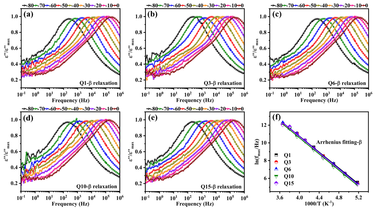 图5. (a~e)不同老化时间下淬火样品在24 h内的β弛豫介电损耗谱;(f)相对应的β弛豫Arrhenius拟合结果。