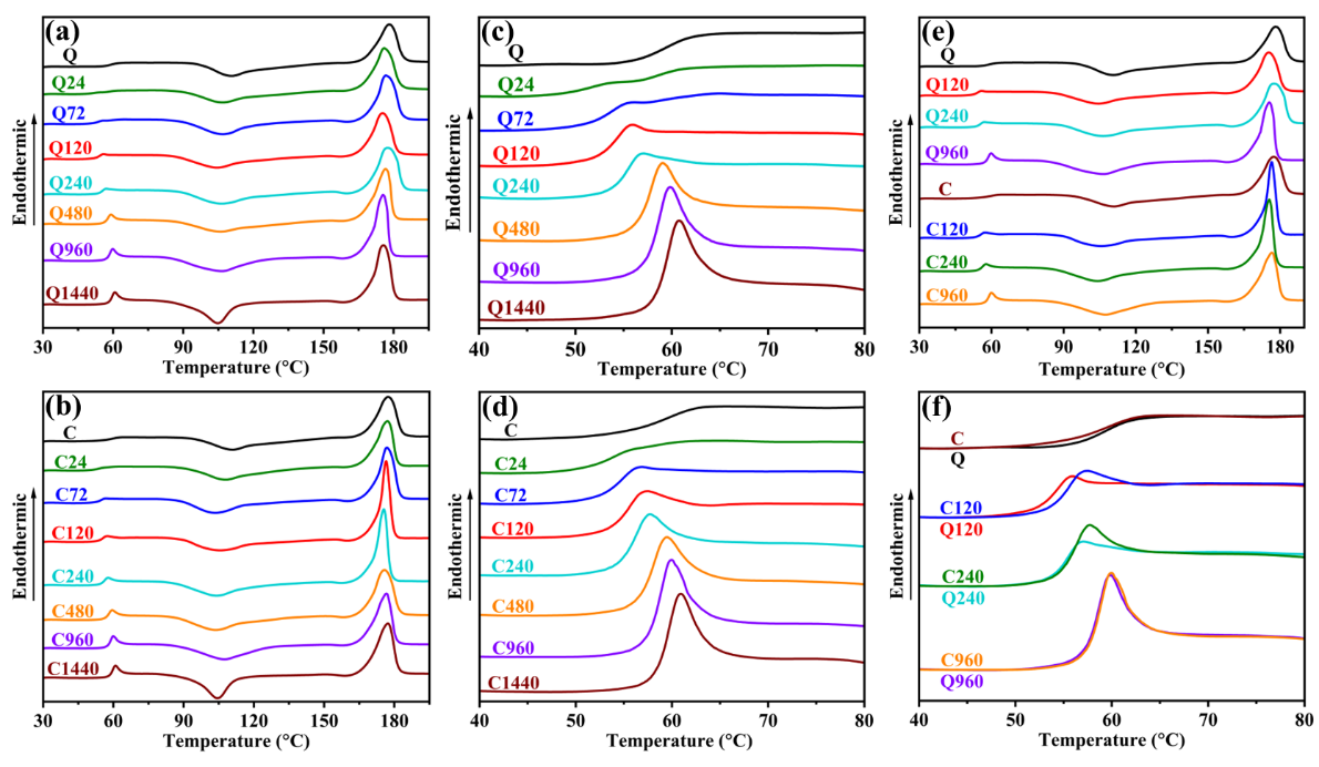 图2. 不同老化时间下(a)淬火和(b)冷压试样的DSC一次升温曲线;(c、d)两种试样在玻璃化转变区域的DSC曲线;(e、f)不同样品之间DSC一次升温曲线的比较。