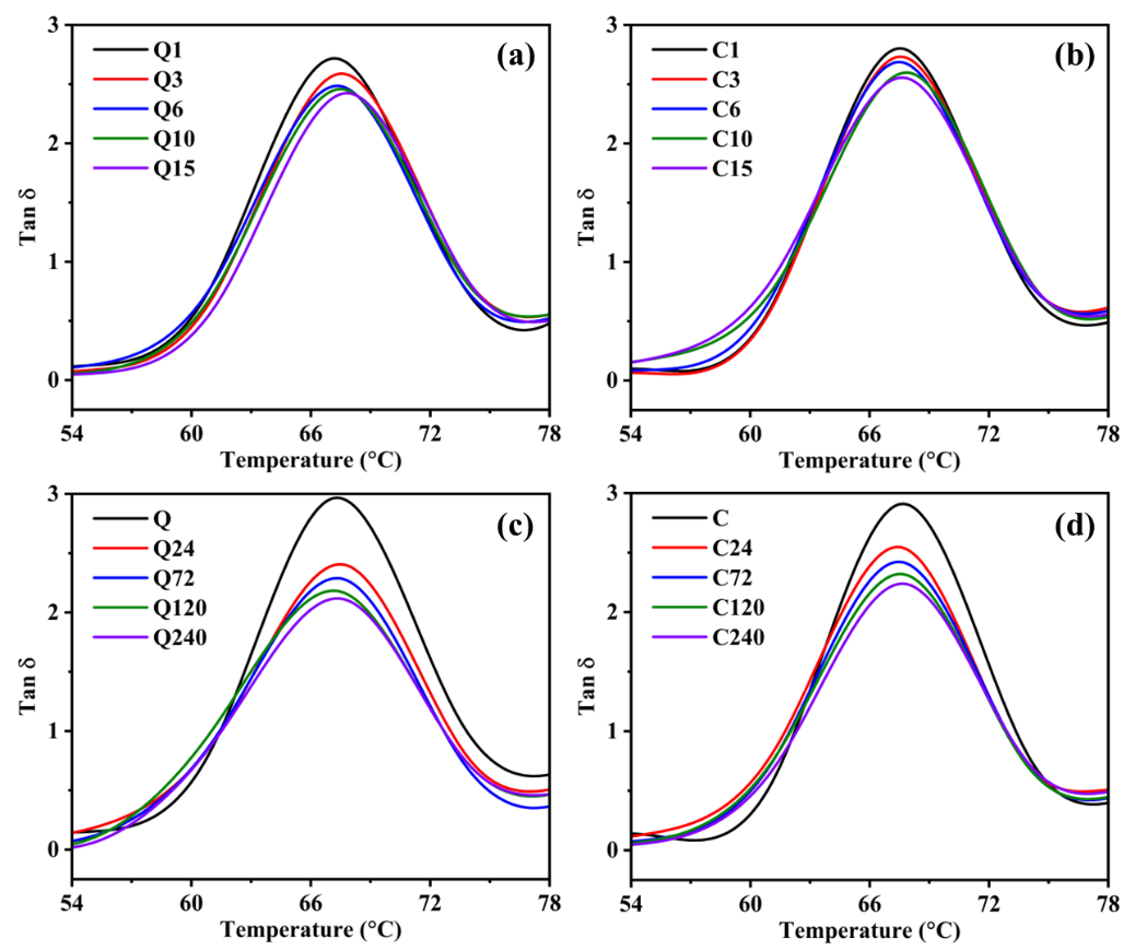 图3. (a、c)淬火和(b、d)冷压试样的损耗因子(tanδ)随物理老化时间的变化情况。
