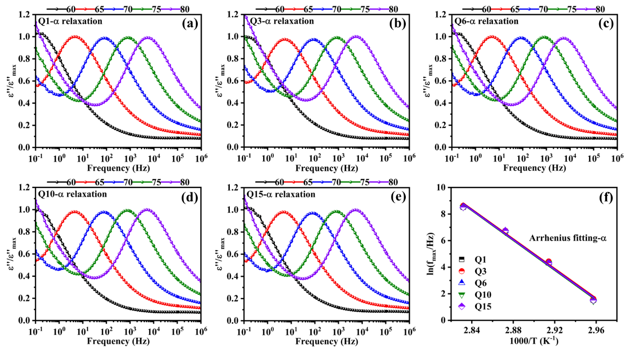 图4. (a~e)不同老化时间下淬火样品在24 h内的α弛豫介电损耗谱;(f)相对应的α弛豫Arrhenius拟合结果。