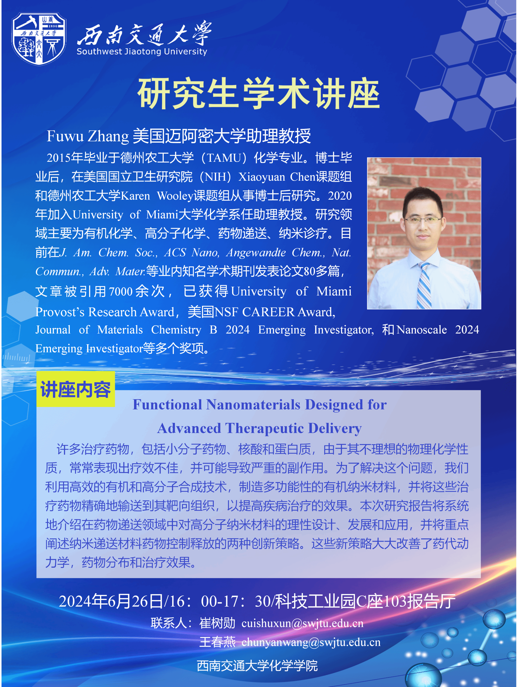 看看屋 研究生学术讲座:《Functional Nanomaterials Designed for Advanced Therapeutic Delivery》