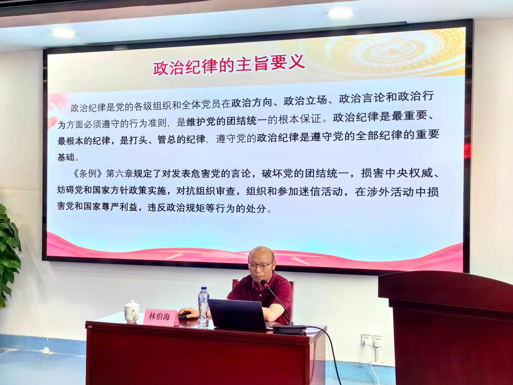 林伯海教授以党纪学习教育的目标要求、党纪学习教育的方式方法开篇,从《条例》历次修订思路看政党政治逻辑、把握“六项纪律”的主旨要义和规定要求、以伟大自我革命铸强党员干部的党性修养三个方面进行了深入解读,指出了《条例》修订的具体内容,强调要牢牢把握党的纪律建设的政治属性、时代特征以及六项纪律的主旨要义,并以违反纪律的实际案例向全体成员进行了警示。