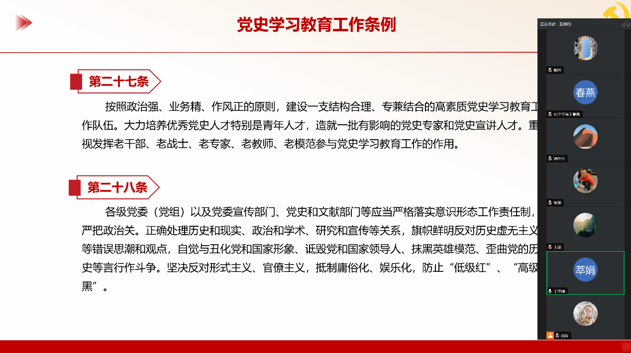 2024年3月14日下午14:00,应用化学党支部结合支部党员实际情况,在前期充分自学的基础上,通过线上线下相结合的方式,全体支部党员集体参与3月主题党日活动。主题党日活动主要学习内容包括习近平总书记在中共中央政治局第十一次集体学习时的重要讲话精神、教育部党组书记、部长怀进鹏在《求是》杂志发表的署名文章《厚植爱国情怀培育时代新人》、以及《党史学习教育工作条例》。党支部书记王萃娟同志主持活动,对学习内容以及传达的精神做出详细讲解。学院院长周祚万同志出席活动。