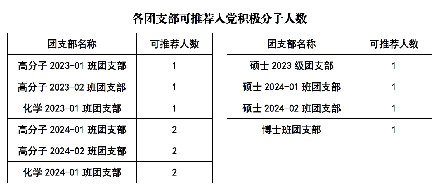 各团支部根据下方可推荐人数推荐入党积极分子,要求推荐人应获得超过半数赞成票,于会后对拟推荐学生进行考察,考察不唯票数,结合实际情况形成团支部意见,并参照模板(附件4)填写《看看屋