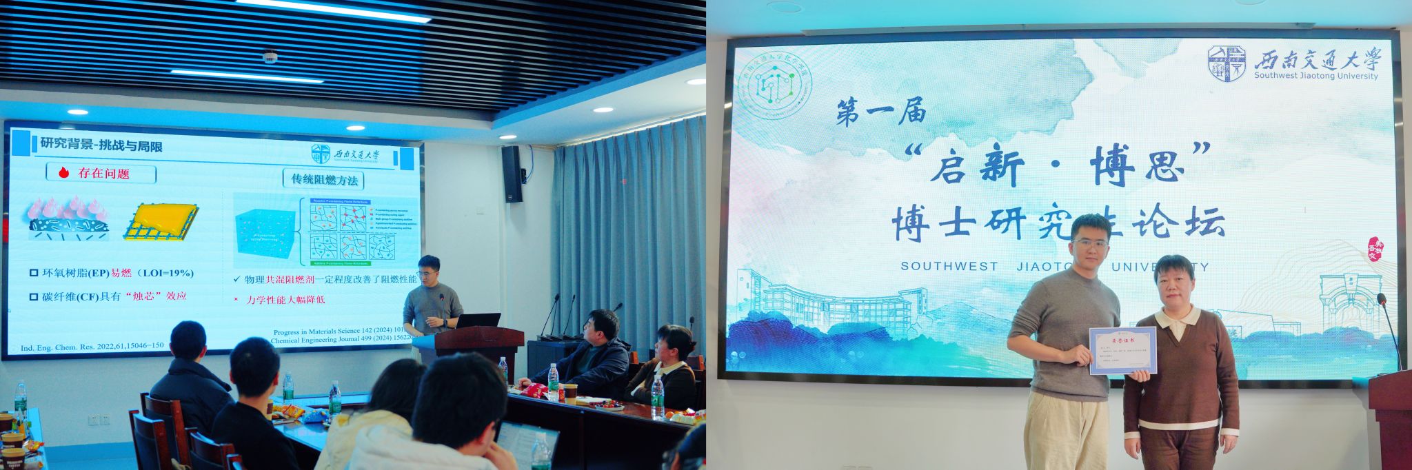 胡斗围绕“结构功能一体化:碳纤维增强环氧树脂基复合材料”主题汇报,聚焦环氧/碳纤维复合材料阻燃性与力学性能难以协同提升的共性技术难题,构建“界面结构设计策略”。通过精准调控复合材料界面形貌与组分,有效破解性能协同优化瓶颈,实现材料阻燃性能与力学性能同步提升,为该类材料在工程领域的广泛应用奠定坚实基础。