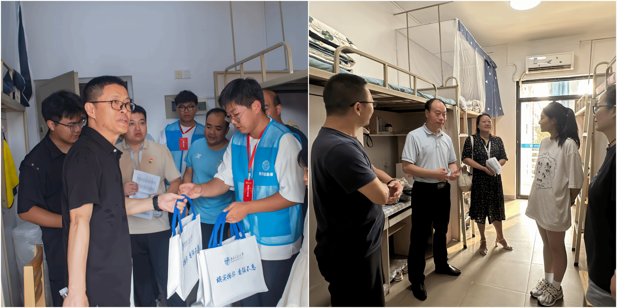 新生报到后,向仲敏书记、周祚万院长深入宿舍了解学生情况,并为新同学赠送学院特别定制的专属大礼包,帮助学生和家长更好地熟悉校院情况。向书记、周院长还细致询问了新生学习与生活情况,关心关怀着同学们到校后对环境、饮食等是否适应,并围绕“高中生到大学生的角色转变”这一问题给同学们提出了指导与建议。